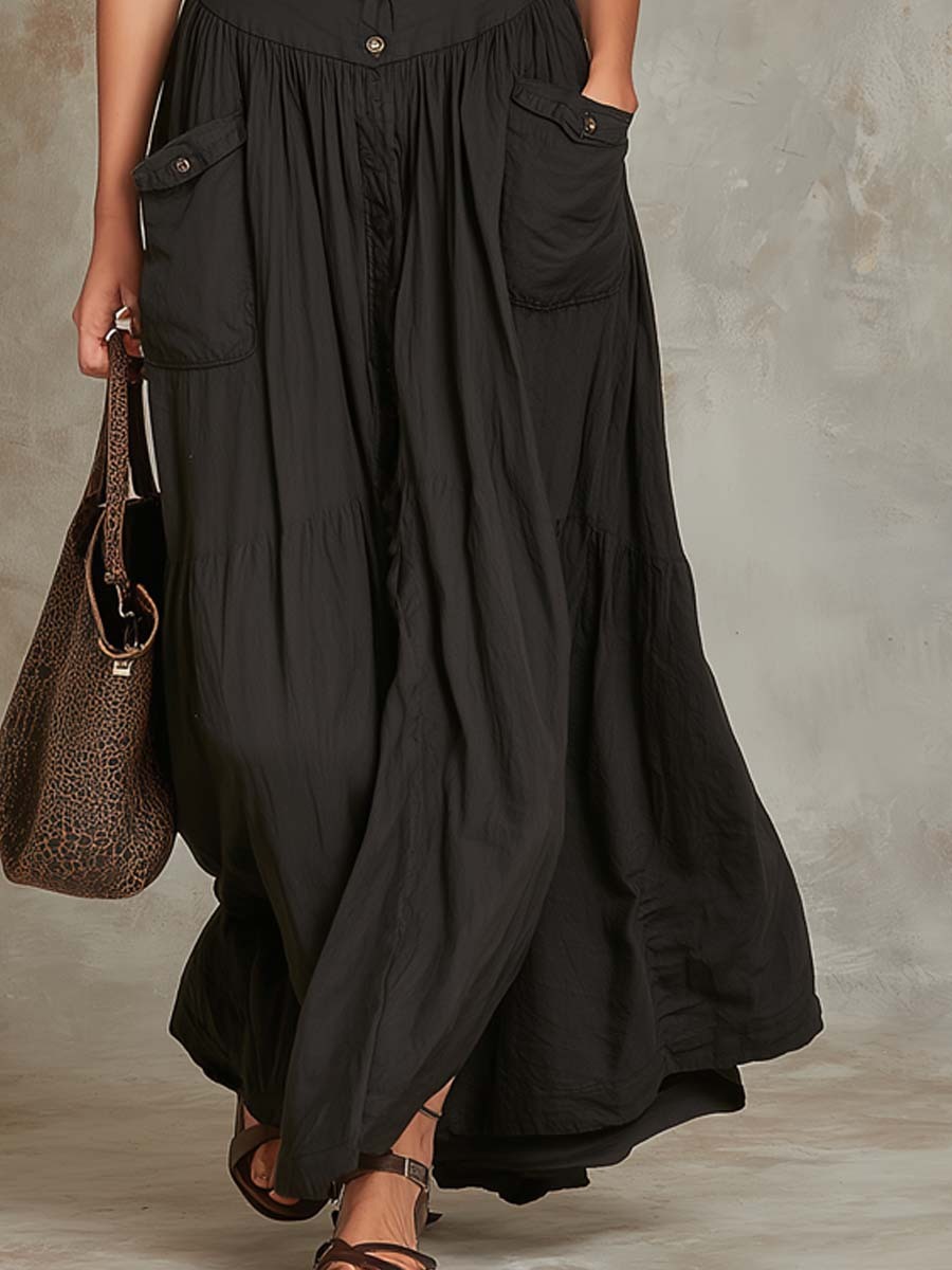 Retro Flap Pocket Cotton Maxi Dress