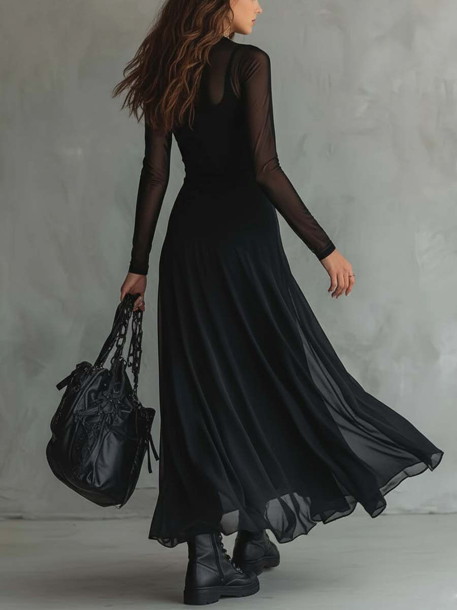The Retro Sheer Sleeves Maxi Dress is a timeless piece that seamlessly blends vintage charm with contemporary elegance. Designed with a floor-length silhouette, this dress features delicate sheer sleeves that add a touch of subtle allure and sophistication. The lightweight fabric drapes gracefully, ensuring effortless movement and comfort.